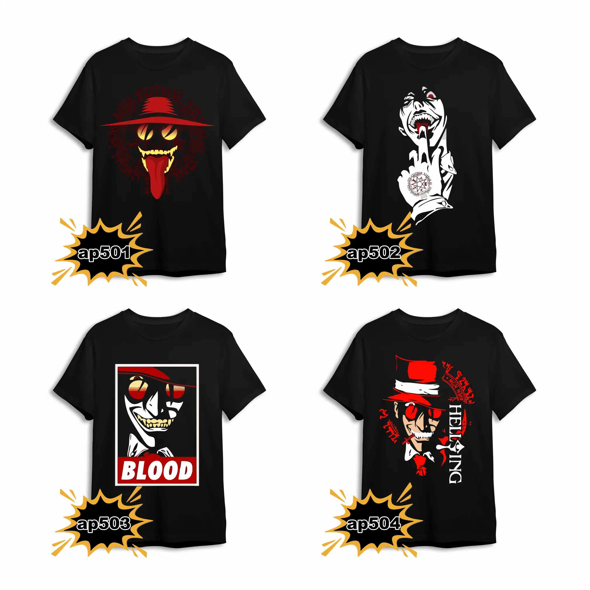 Cada diseño captura la presencia imponente de Alucard, el cazador definitivo, con ilustraciones sangrientas y un estilo gótico inconfundible.