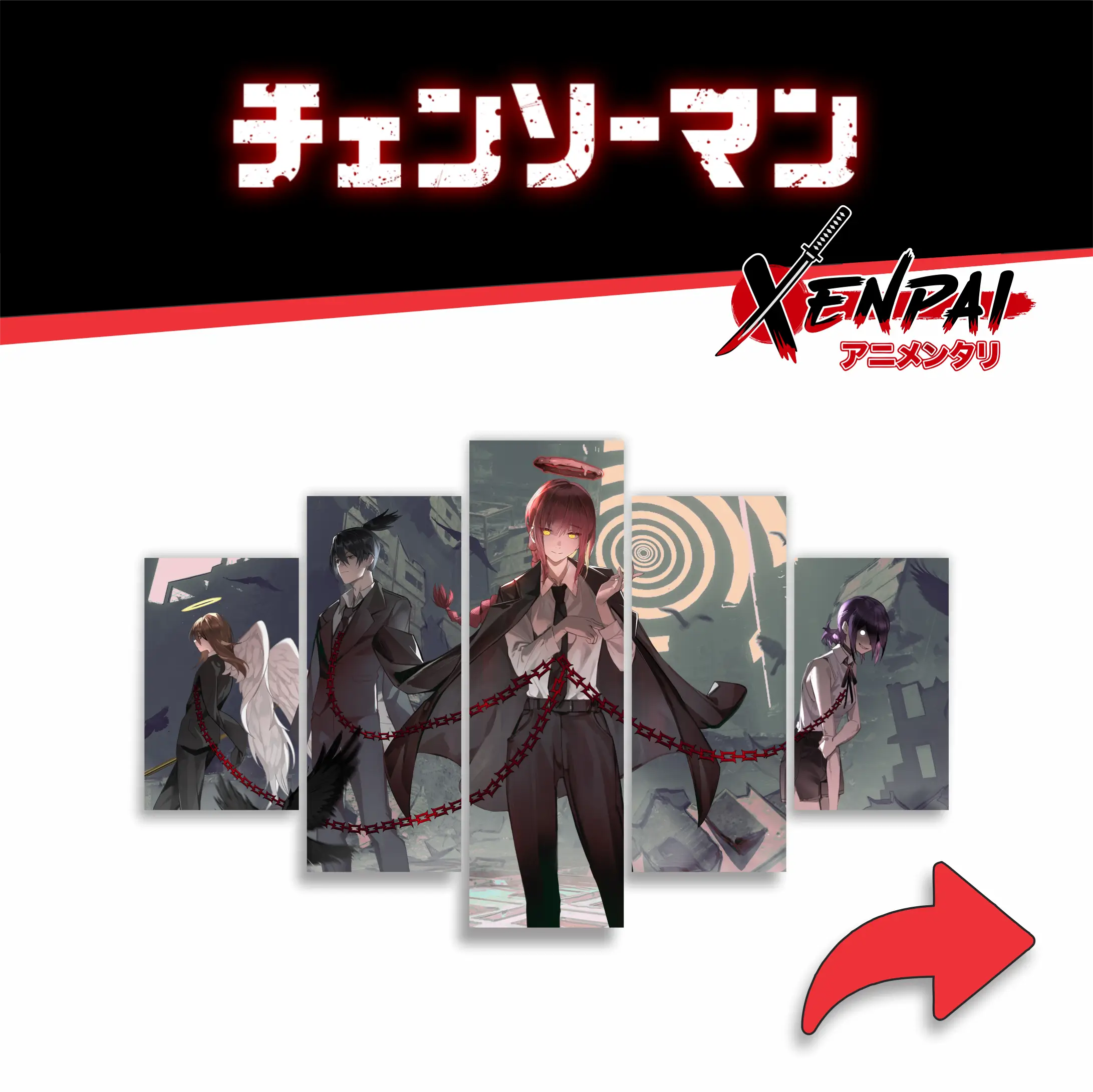 Los cuadros de 5 piezas de Chainsaw Man de Xenpai son una explosión visual que captura la locura y la furia de Denji, Power y Makima en su máximo esplendor. ⚙️🩸